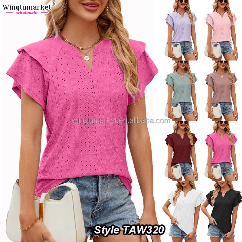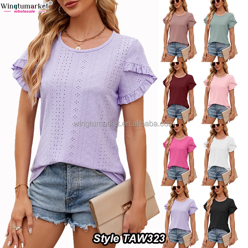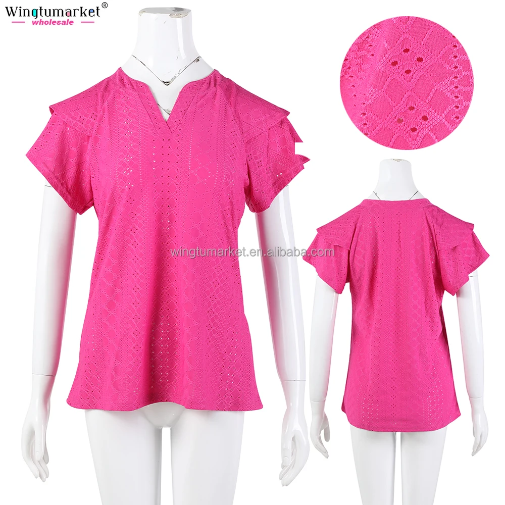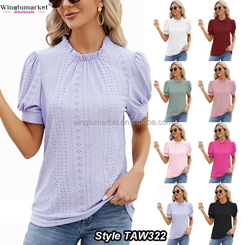 Casual Ladies Blouse Office Summer Eyelet Short Sleeve Tops Frills Neck Ruffles Blouses Elegant Shirts for Women